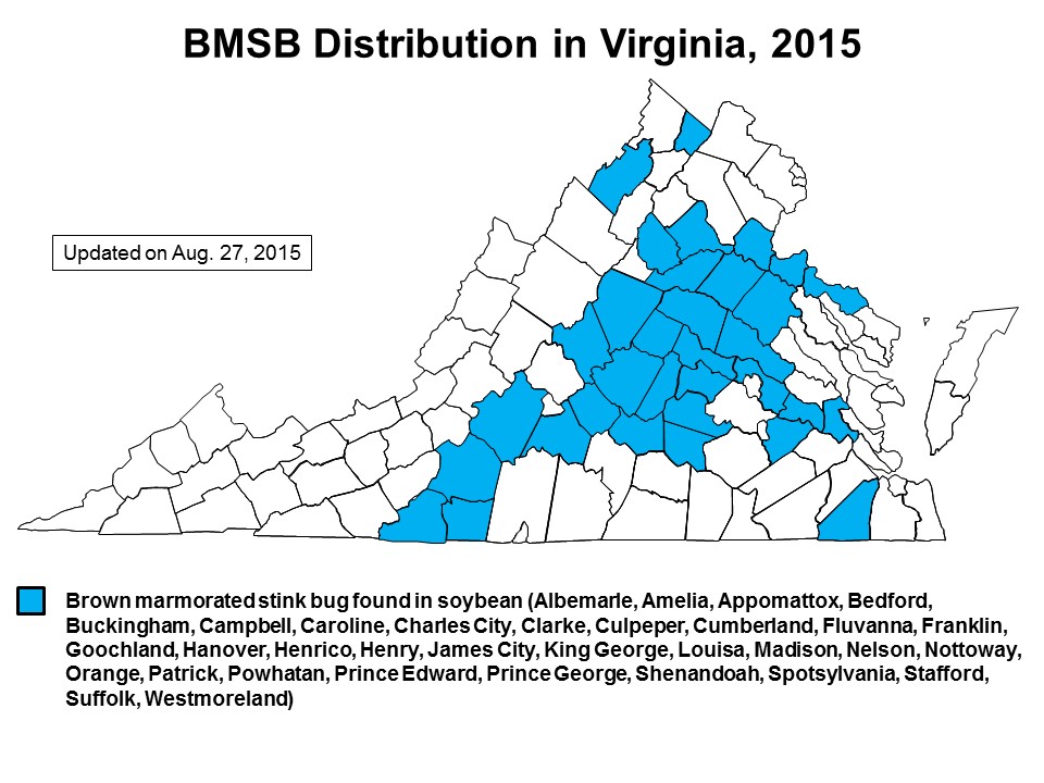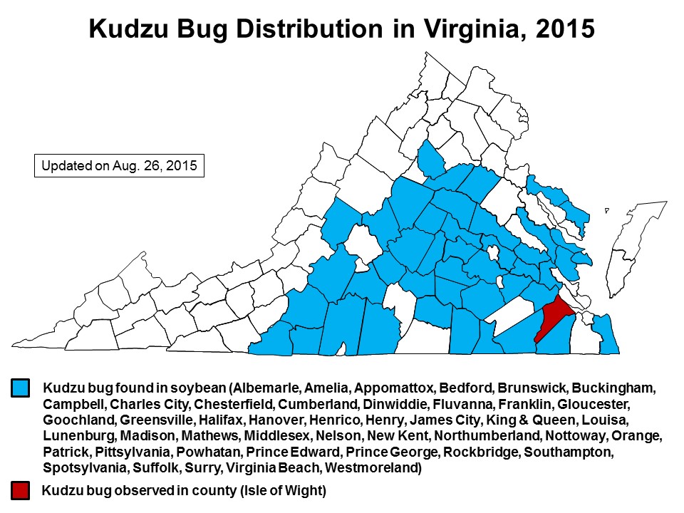 Brown marmorated stink bug and kudzu bug were found in soybean in several additional Virginia counties this week–please refer to the distribution maps below.  Fields at or above the BMSB threshold of 3 to 5 total adults + medium and large nymphs in a 2-minute visual count were found in the following counties:  Bedford (12 BMSB per sample), Shenandoah (8 BMSB), Nelson (4 BMSB) and Henry (3 BMSB).   Thanks to our scouts Ed Seymore and Jamie Hogue, and to ANR Agent Scott Reiter for their reports this week.  BMSB_map_27_Aug_2015KB_map_26_Aug_2015