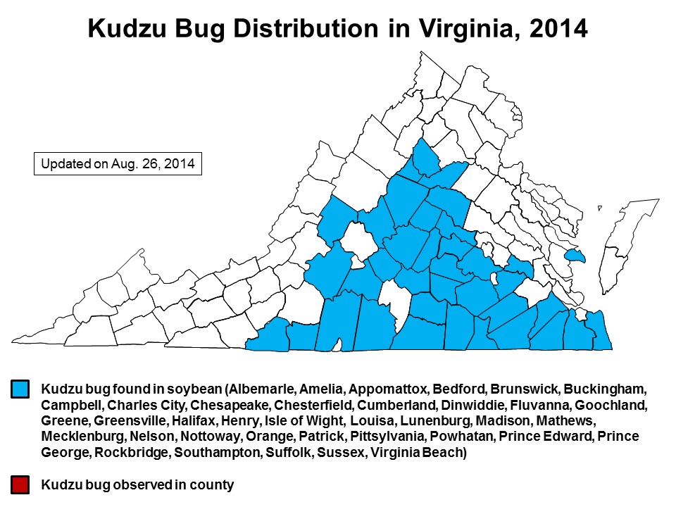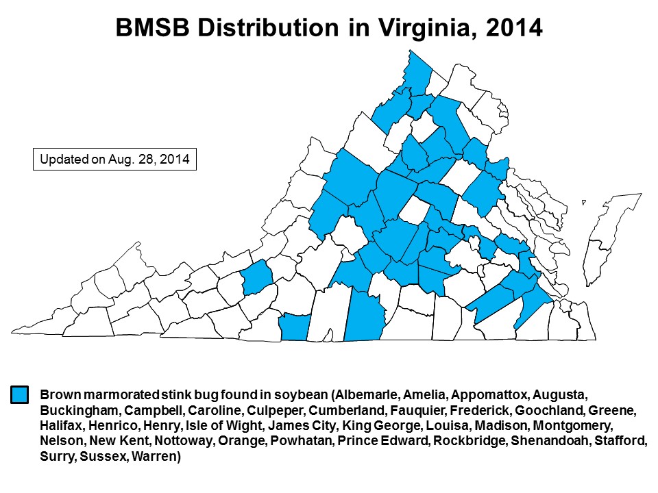 We are still finding BMSB and KB in new places—7 new counties for BMSB (Sussex, Albemarle, Cumberland, New Kent, King George, Isle of Wight, and Surry), and KB in 3 new counties (Mathews, Mecklenburg, and Virginia Beach)—but numbers in all locations are way down compared with last year (see the maps below). No fields are at threshold for either pest, but a couple of fields were identified in James City County that have some infested edges. The full season crop is going to be safe from injury soon, when plants grow through the R6 stage. As the season moves into late summer and early fall, double crop fields will provide one of the few good late season food sources for all stink bug species—so they will need to scouted until they are safe from injury.