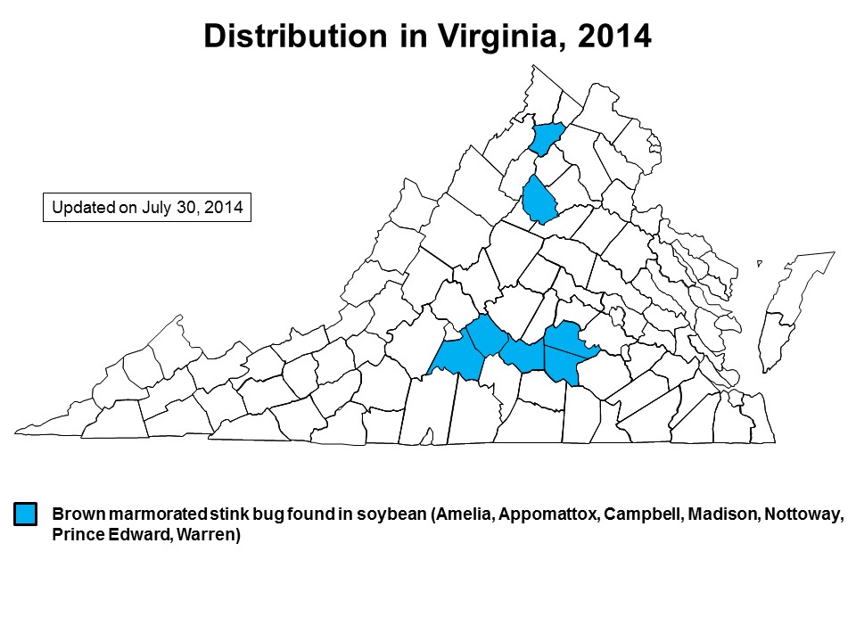 As of this week, brown marmorated stink bug adults, nymphs, and egg masses are beginning to show in a few soybean fields in seven counties (Madison, Warren, Campbell, Appomattox, Prince Edward, Amelia and Nottoway). Number are still very low but more are expected as they move from border trees into fields. This early movement is coinciding with the maturity of the soybean crop. Most of the plants in the infested fields are in late R3-early R4 growth stages. When plants reach the R5 stage (seed fill), they will become even more attractive to stink bugs that target young seed to feed on.