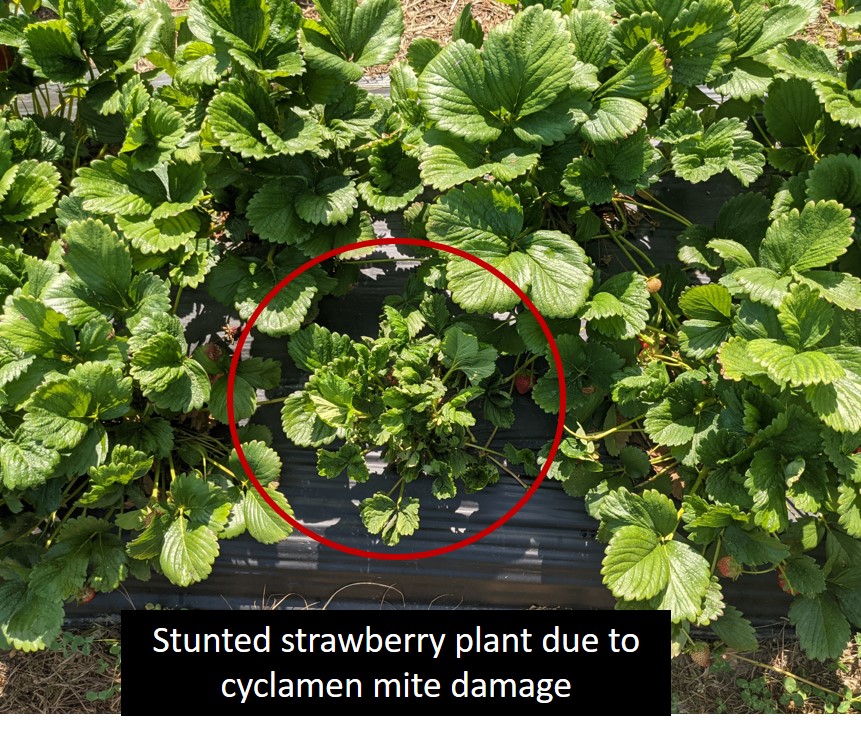 The cyclamen mite is a serious pest of strawberries. It has been reported in most strawberry-producing states. Cyclamen mites are tiny mites (0.001 in long) that feed on the tissue of nonexpanded and newly unfolded leaves in the strawberry plants. Adults and immatures of the cyclamen mite are considerably smaller than two-spotted spider mites and cannot be easily seen with the naked or a hand lens. Symptoms of cyclamen mite infestation include severely crumpled and crinkled leaves, as well as stunted plants.