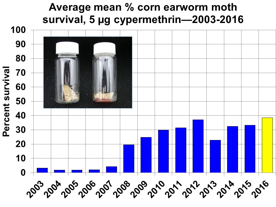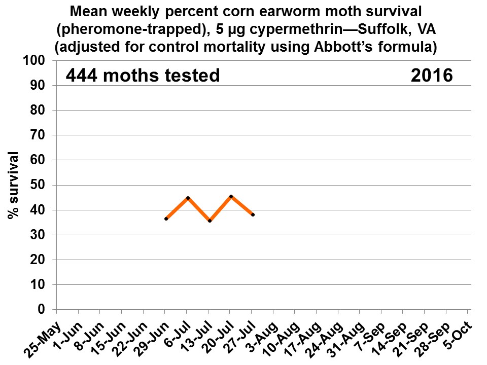 We have vial-tested 444 moths in 2016, with a mean of 38.5% surviving the 24-hour exposure to the pyrethroid insecticide cypermethrin at 5 micrograms. These moths all were captured in Suffolk pheromone traps. While we aren’t able to say where these moths originated (they are strong fliers and could have grown up locally or far away), survival rates this high serve as a reminder that alternative (i.e., non-pyrethroid) chemistries may need consideration for corn earworm (bollworm) management, especially if heavy infestations develop. We are working with Johnny Parker and some Southampton Co. growers to trap in an area reported to have high numbers of corn earworm moths near Franklin–results of the vial testing in that location will be available next week.