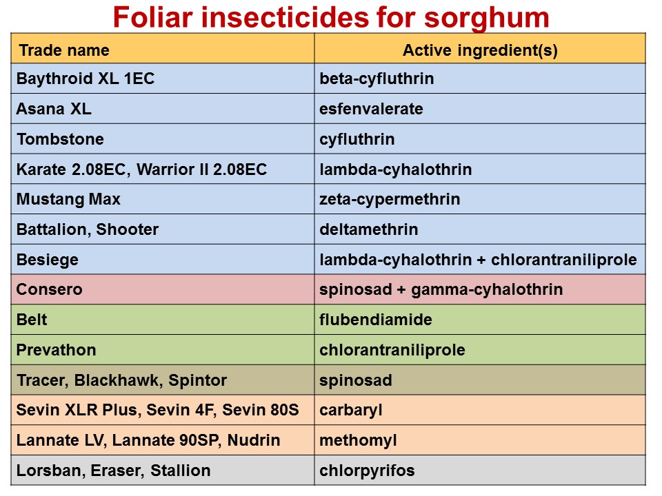 A final note, a broadcast spray pattern is probably the least effective way to achieve a good worm control. Treatments will be more effective if you can set up a boom with a nozzle over the row, or multiple nozzles to direct the spray to heads, only, and deliver 12-15 gal per acre. The table below provides a fairly comprehensive list of insecticides labeled for use in sorghum. We have generally achieved the best control when we have included a non-pyrethroid like Belt, Prevathon, Besiege, or Blackhawk. Check labels for rates and other use information.