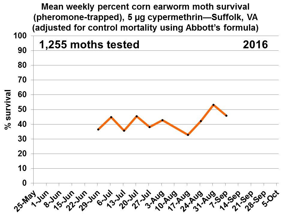 KB_map_6_Sep_2016Corn earworm/bollworm (Helicoverpa zea) resistance monitoring:  The number of moths surviving the 24-hour exposure to 5 micrograms of cypermethrin in this week’s vial tests was 45.8% (n = 180 moths evaluated).  The seasonal average is 43.4% survival, based on 1,255 moths tested. AVT_7_Sep_2016Black light trap counts:  Corn earworm moth captures dropped slightly from the previous weeks’ counts; brown marmorated stink bug counts were zero across all reporting stations.  Please see the attached tables (pdf document) for more details:  BLT_8_Sep_2016