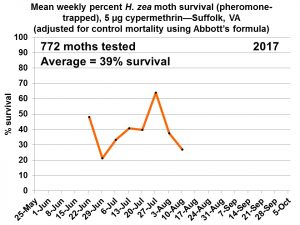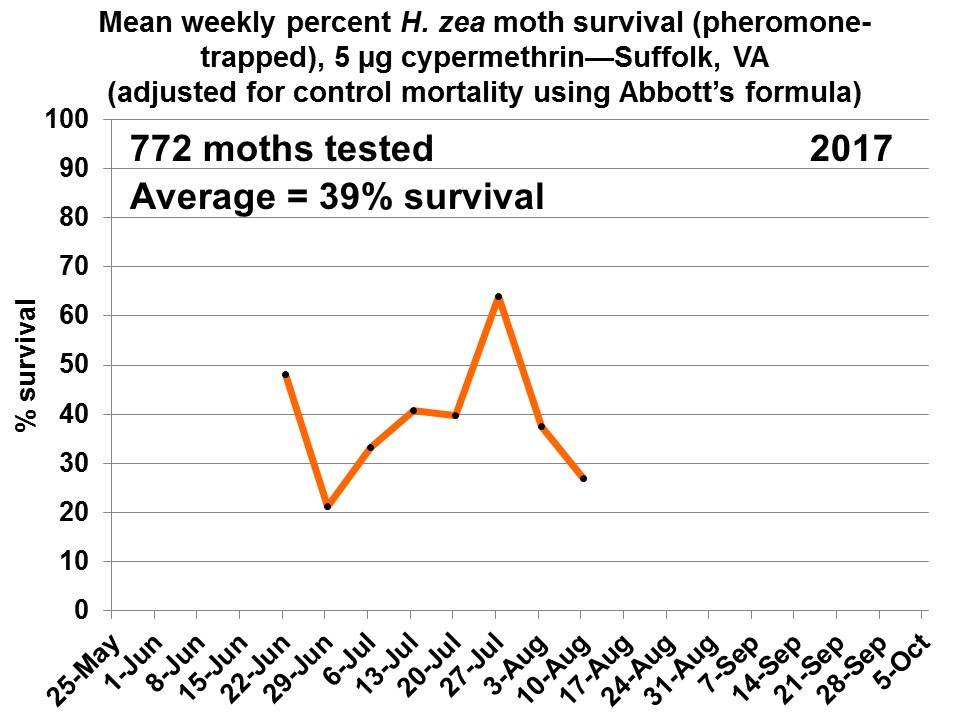 Resistance monitoring of corn earworm/bollworm shows that this season in Suffolk, an average of 39% of moths survived the 24-hour exposure period to the pyrethroid, cypermethrin.
