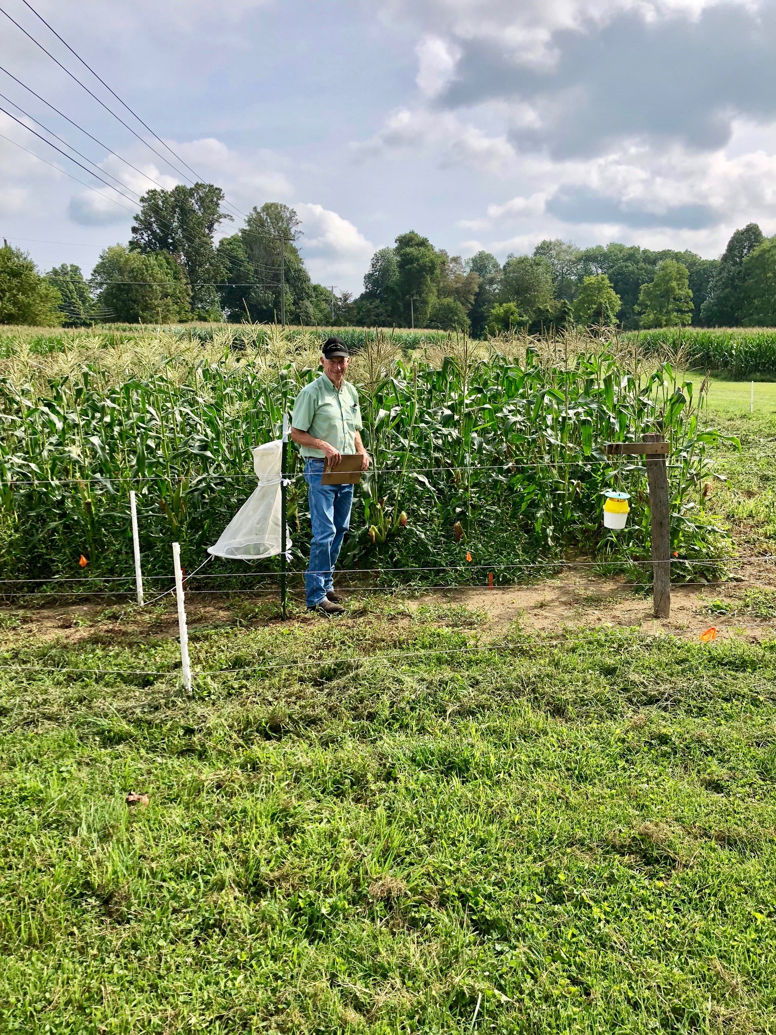 Researchers have demonstrated that certain trap types are better for certain moth species. We are monitoring fall armyworm moths using the bucket trap baited with a Trece FAW pheromone lure and placed near corn fields. We are monitoring the presence of pickleworm moths using the Trece Deltatrap baited with the pheromone lure and placed around pumpkin fields. Corn earworm is monitored using the Heliothis mesh trap or the Hartstack wire mesh trap, which catches the most corn earworm moths among all trap types.