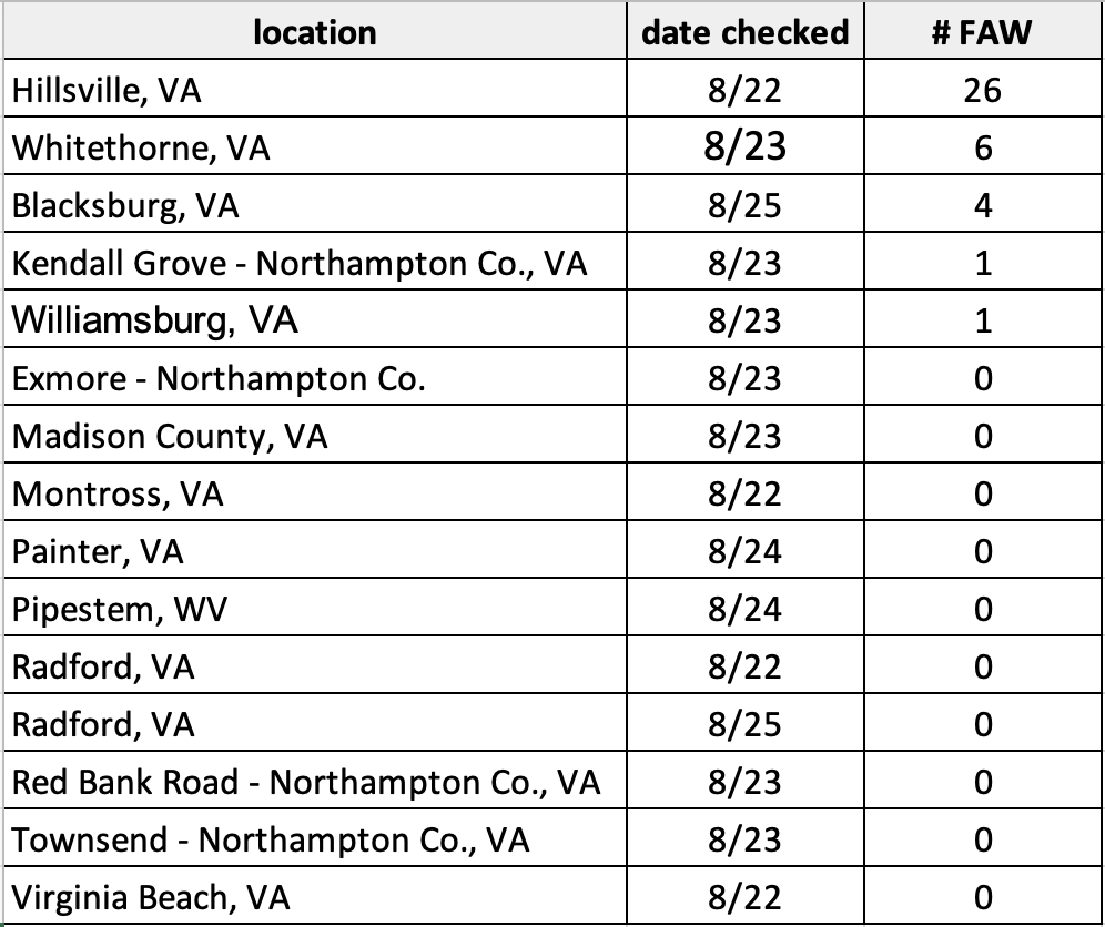 This week FAW adults were observed at 5 of 15 monitoring locations throughout the state. Western regions (Carroll and Montgomery counties) of the state had greater counts (4-26 individuals) though adults were also observed (1 individual) in eastern Virginia (Williamsburg and Northampton County). See table for all locations and counts.