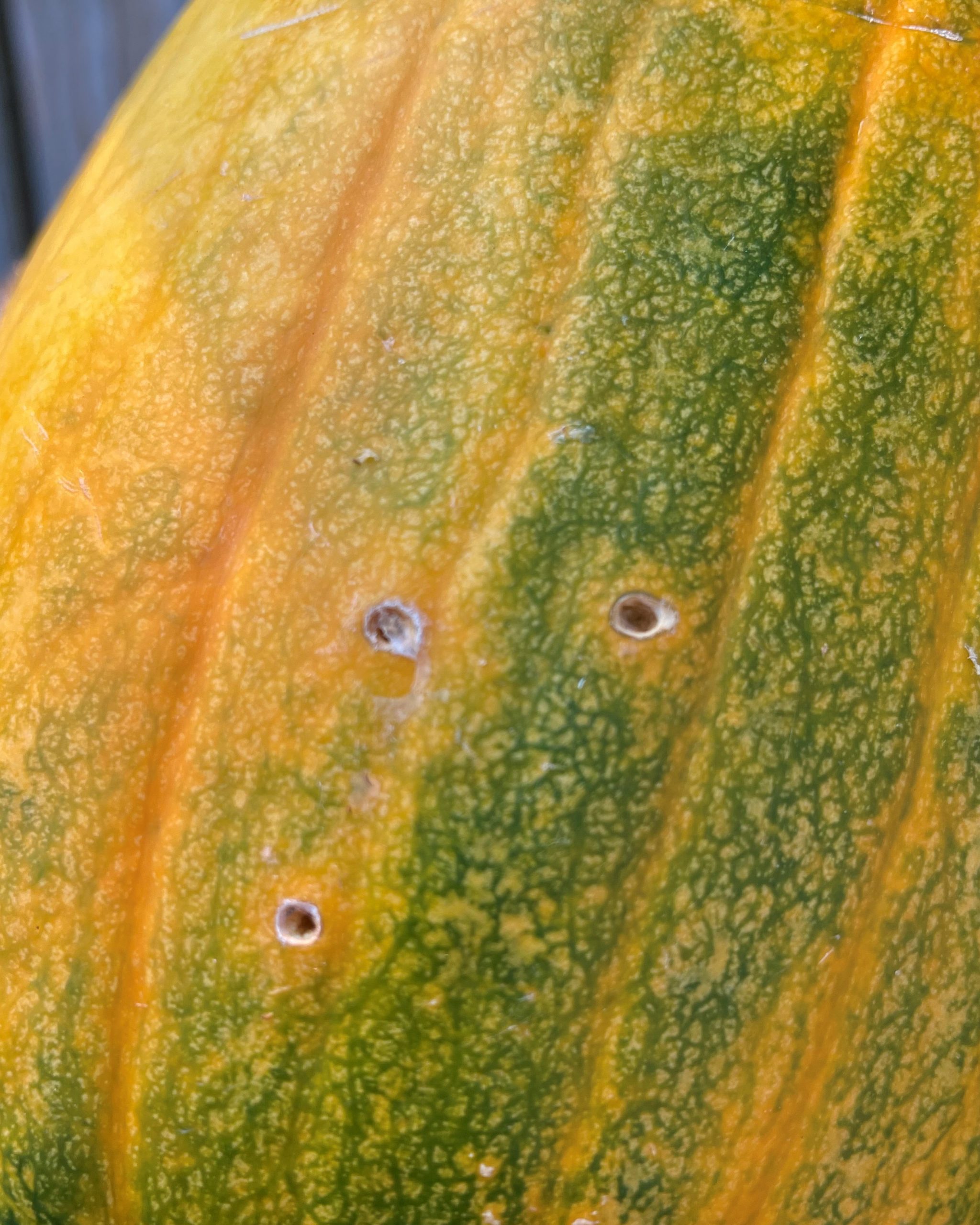 Last week, we continued to find pickleworms borrowing into zucchini squash flowers (Fig. 1) in the Eastern Shore, whereas the incidence of melonworms borrowing in the fruit started to decrease. Additionally, there was evidence of pickleworms borrowing into garden-grown pumpkins in the Chesapeake area, including new borrowing holes found on fruit harvested after a few days (Fig. 2-3).
