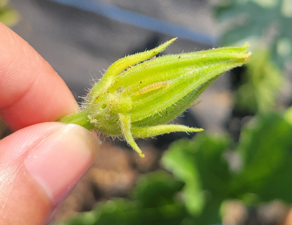 Both melonworms and pickleworms have been detected in squash plantings yesterday in Cape Charles and Machipongo farms. Approximately, 80% of the plants showed at least one flower bud/fruit with borrowing injuries. Most of the squash fruit and flower buds contained 1-2 melonworms in the latest stages of their larval development (4th-5th instar, Fig. 1). Pickleworms on the other hand, have just started to show up in the area and only 1st to 3rd larval instars were found, most of them on top of flower buds and growing fruit (Fig. 2). Both pests were also detected in one cucumber planting on approximately 30% of the plants sampled. These pests have been detected in squash plantings in Blacksburg this week at a lower infestation rate compared to the Eastern Shore.