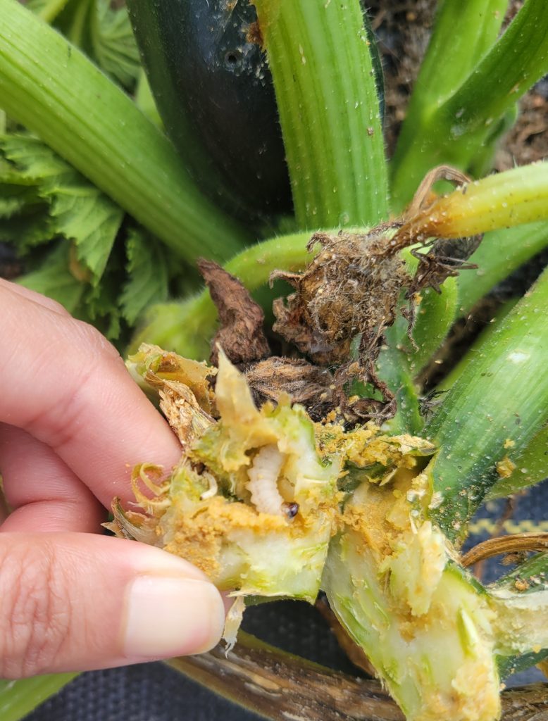 Useful tip: Pickleworms and melonworms are NOT the same as squash vine borers. Squash vine borers borrow into the stems causing severe damage and eventually plant death (Fig. 3), unlike pickleworms and melonworms that feed mostly on the reproductive parts of the plant and occasionally the leaves.