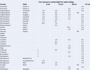 Corn earworm moth catch in VA for week ending – July 27, 2018.