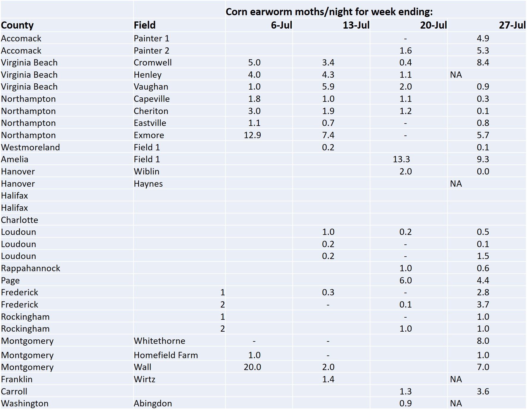 A big thank you to the 14 VCE agents that are monitoring these pests on sweet corn farms in 17 different counties in Virginia: Phil Blevins (Washington Co.); Chris Brown (Franklin Co.); Jason Cooper (Rockingham Co.); Ursula Deitch (Northampton Co.); Helene Doughty (Accomack Co.); Roy Flanagan (VA Beach); Bob Jones (Charlotte Co.); Kenner Love (Page and Rappahannock Co.); Laura Maxey Nay (Hanover Co.); Steve Pottorff (Carrol Co.); Stephanie Romelczyk (Westmoreland Co.); Beth Sastre-Flores (Loudoun Co.); Laura Siegle (Amelia Co.); Rebekah Slabach (Halifax Co.); and Mark Sutphin (Frederick Co.). Here are some trap catch results (moths per night) for some of the locations around Virginia for this week (note we do not have data for all locations yet):