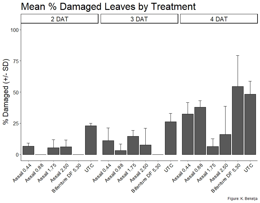Although the percent mortality was relatively low for Assail at the 1.75 rate, as shown in Figure 2, it still seemed to have prevented beetles from feeding on plant material, shown in Figure 3.