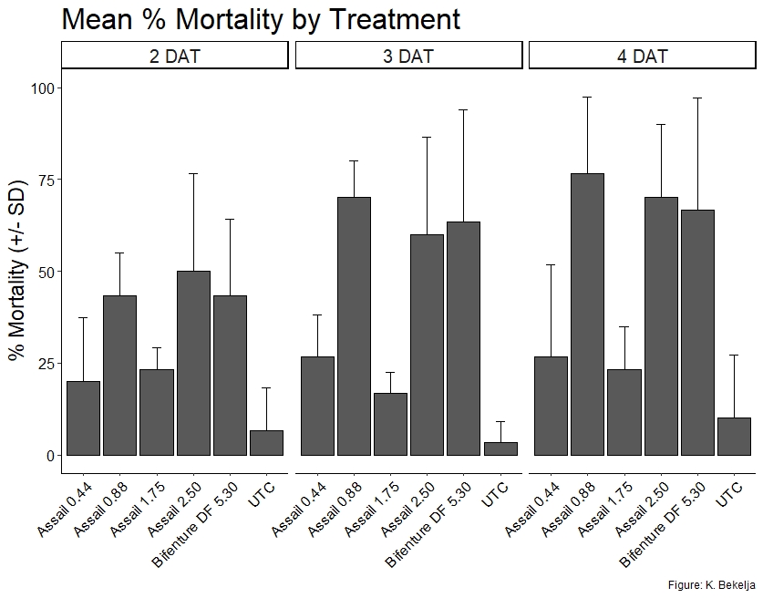 Figure 2. Bar graph showing percent mortality of cucumber beetles at 2, 3, and 4 days after treatment (DAT).