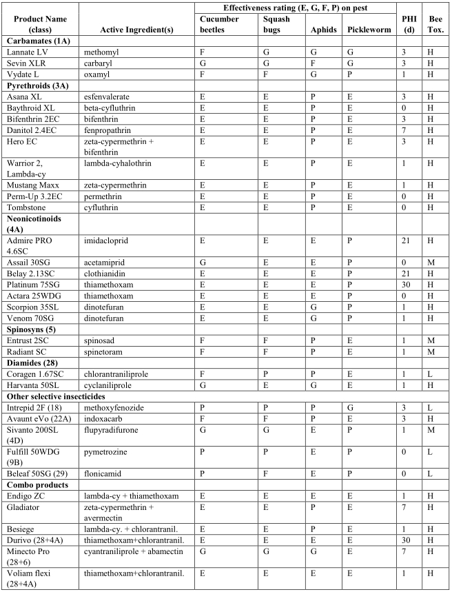 Table 1. Insecticides for managing key pests of cucurbits. Effectiveness rating scale: E = excellent; G = good; F = Fair; P = poor (credit: Thomas Kuhar)
