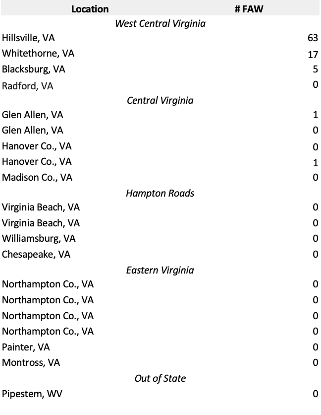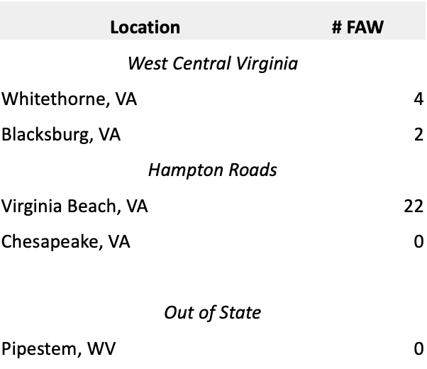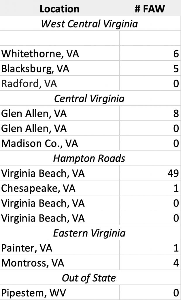 This week FAW adults were observed at 7 of 14 monitoring locations throughout the state. The West Central region (Carroll and Montgomery counties) maintained FAW presence at some sites (5-6 individuals) and more eastern regions of the state (Hampton Roads and Eastern Virginia) experienced increased instances and counts of FAW (1-49 individuals). See table for all locations and counts.