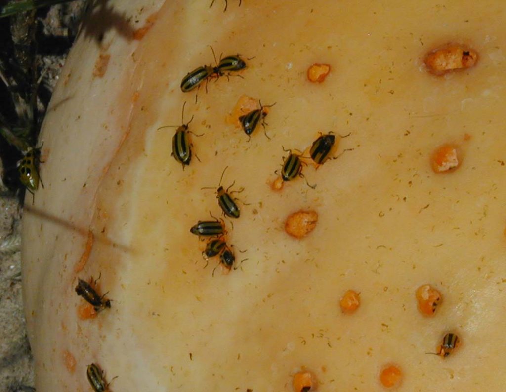 Figure 1. Striped and spotted cucumber beetles feeding on a pie pumpkin (Image credit: Thomas Kuhar)