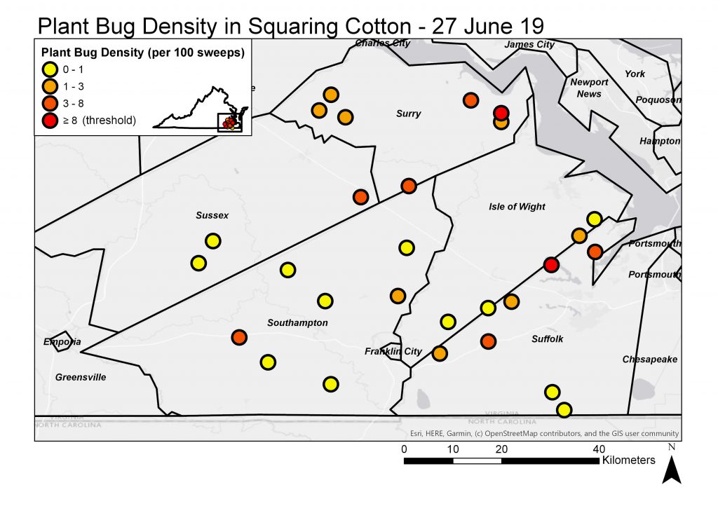 Plant bug populations have been spotty, and lower overall than this time last year (click to see map). 10% or fewer of Virginia fields need insecticide applications this week, but, unfortunately, a much higher percentage will end up treated. Before making a decision to spray without scouting consider several things: