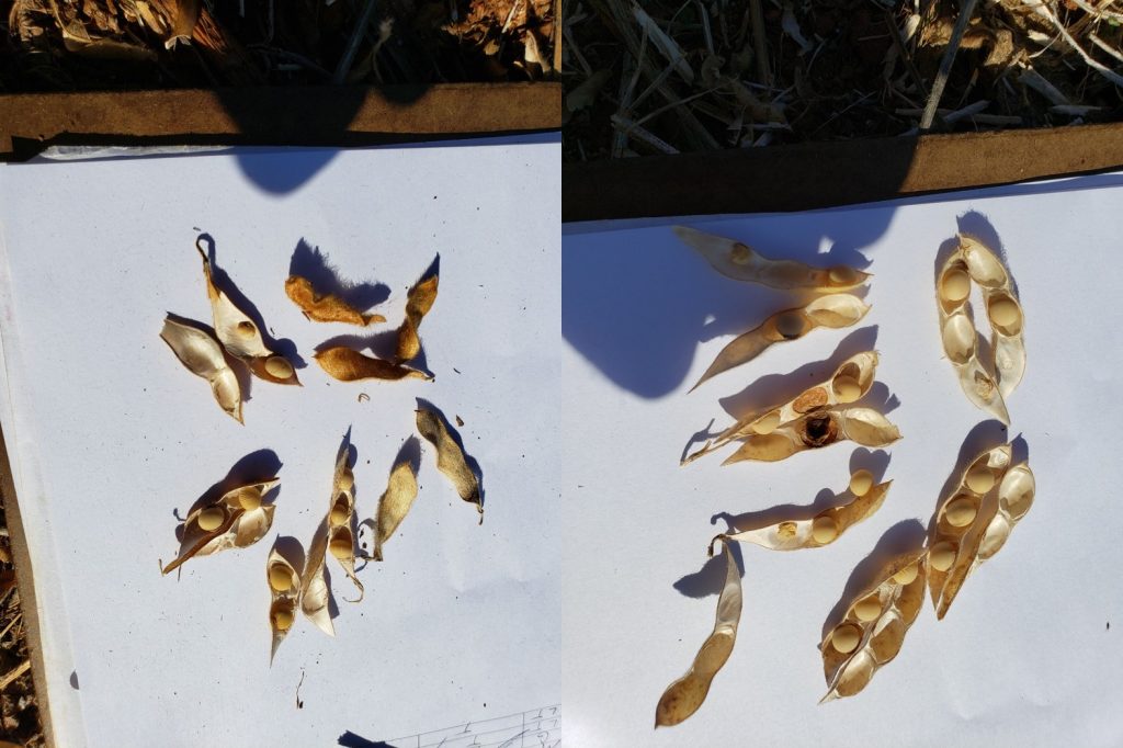 What about the later-maturing varieties that we grow the most of? A casual look at the soybean remaining in the field seem to indicate that we have a pretty good pod load in most cases, with late-planted soybean being the exception. Although the drought did hurt us, it’s somewhat hard to see now. Again, that’s from a casual observation. A closer look at the late-4’s reveal that the yield potential is still pretty good (see photos below; we did not harvest these due to a few varieties not yet being fully mature). Although we had a few aborted and small seed, most were intact. Keep in mind that this is a very good soil (Davidson clay) and the area did pick up a few rains that other parts of Virginia did not.